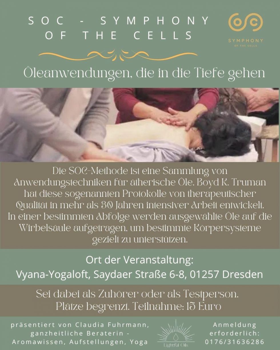 „Symphony of the Cells“ (SOC) ist eine praxisorientierte Methode zur Anwendung ätherischer Öle entlang bestimmter Körperbereiche. Die einzelnen Protokolle von therapeutischer Qualität wurden von Boyd Truman entwickelt, der über mehr als 30 Jahre Erfahrung im praktischen Umgang mit ätherischen Ölen gesammelt hat. Die Methode basiert auf der gezielten Anwendung ätherischer Öle im Rahmen eines ganzheitlichen Wellness-Ansatzes und soll Impulse für Balance und Wohlbefinden geben.